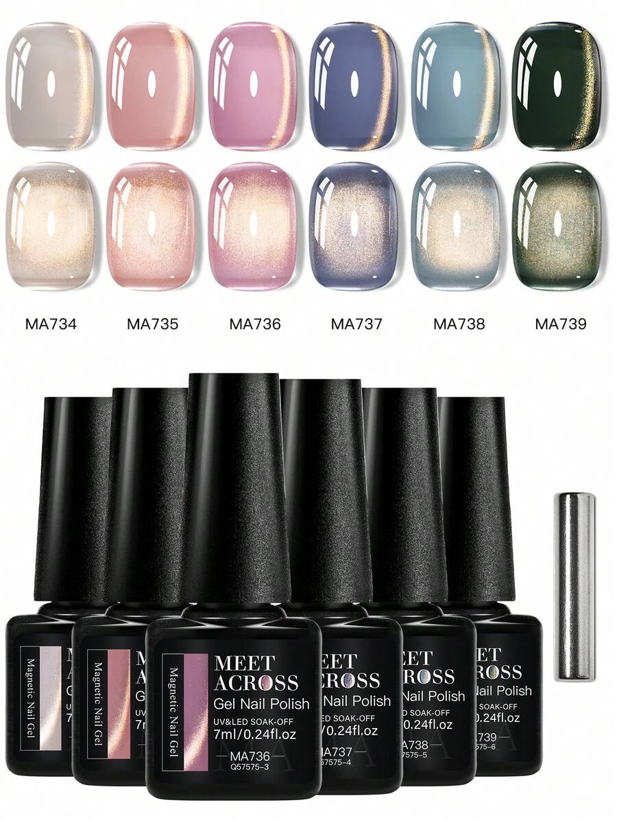 MEET ACROSS 6支装浅金色猫眼凝胶指甲油,带磁性棒;7毫升裸粉色金色闪粉磁性猫眼凝胶指甲油;半永久可卸UV凝胶指甲油,美甲DIY,适用于家庭和美甲沙龙。