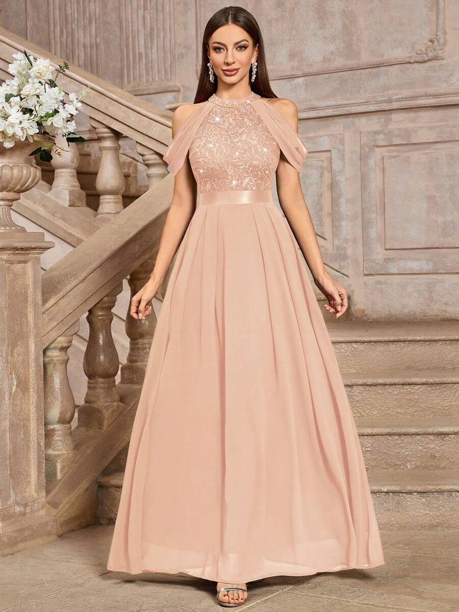 MIUSOL 优雅高领亮片花卉蕾丝露肩晚礼服