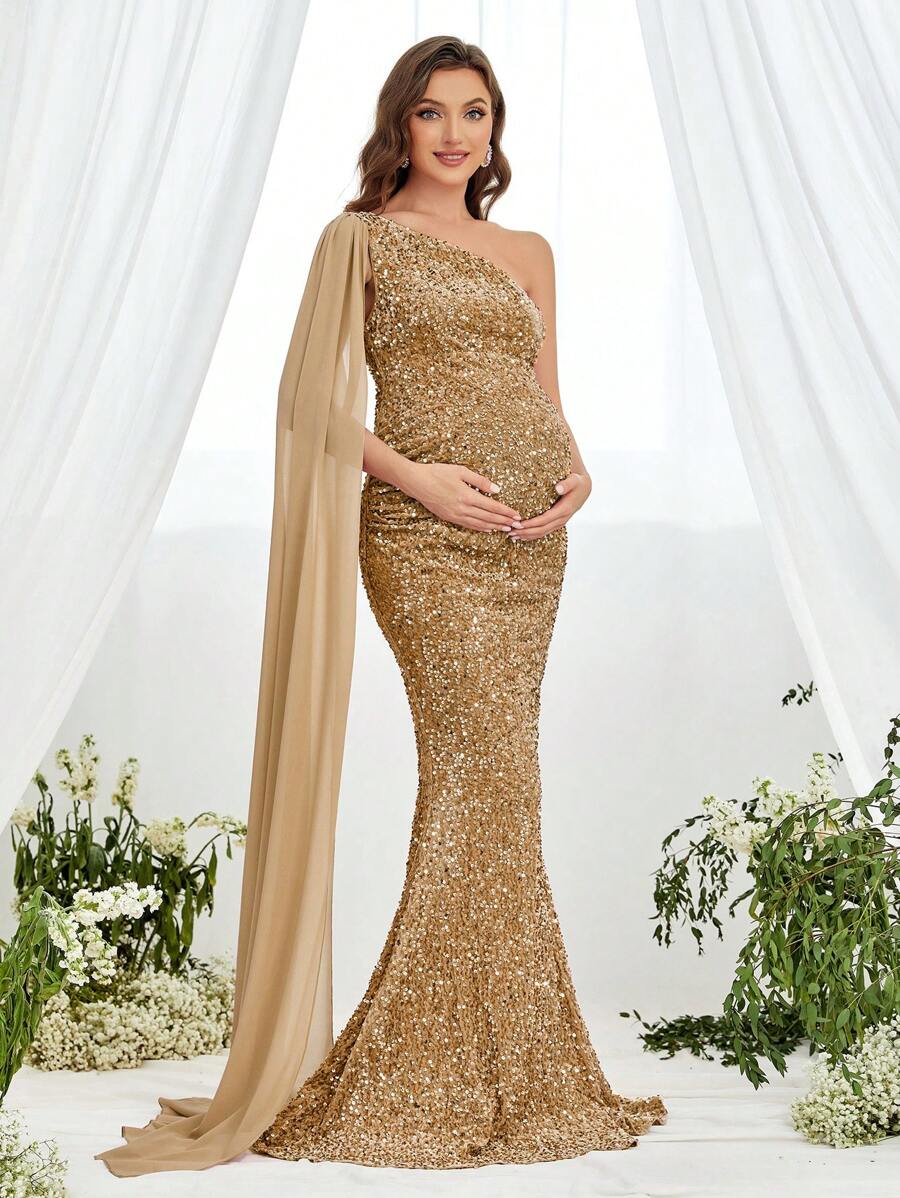 孕妇单肩斗篷袖亮片优雅连衣裙,适合派对