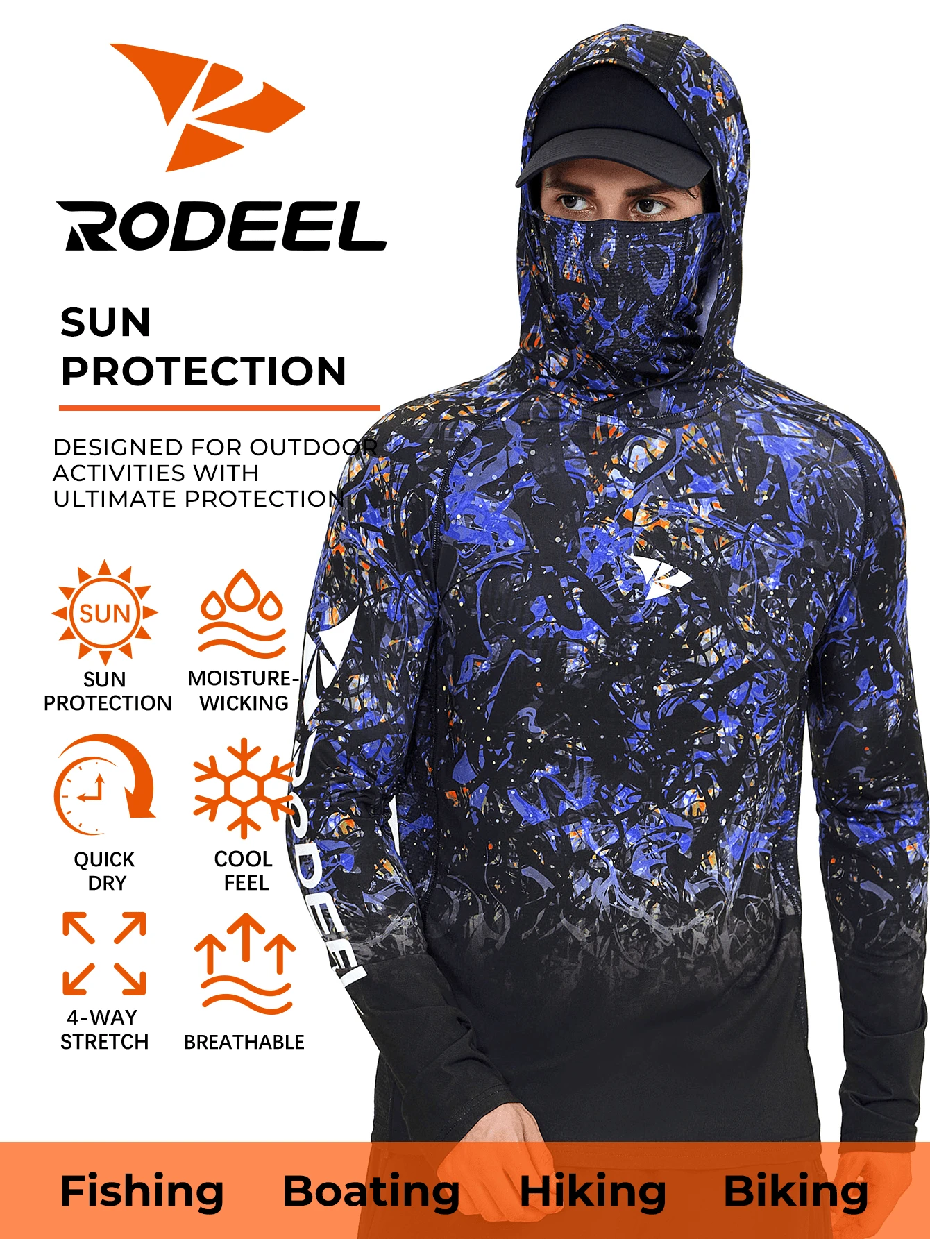 RODEEL 男士连帽 T 恤带面罩渐变印花插肩速干透气长袖适合户外运动钓鱼和徒步旅行