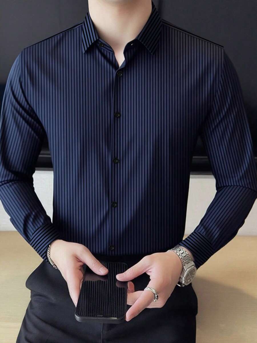 男士时尚商务休闲条纹印花长袖衬衫,秋季