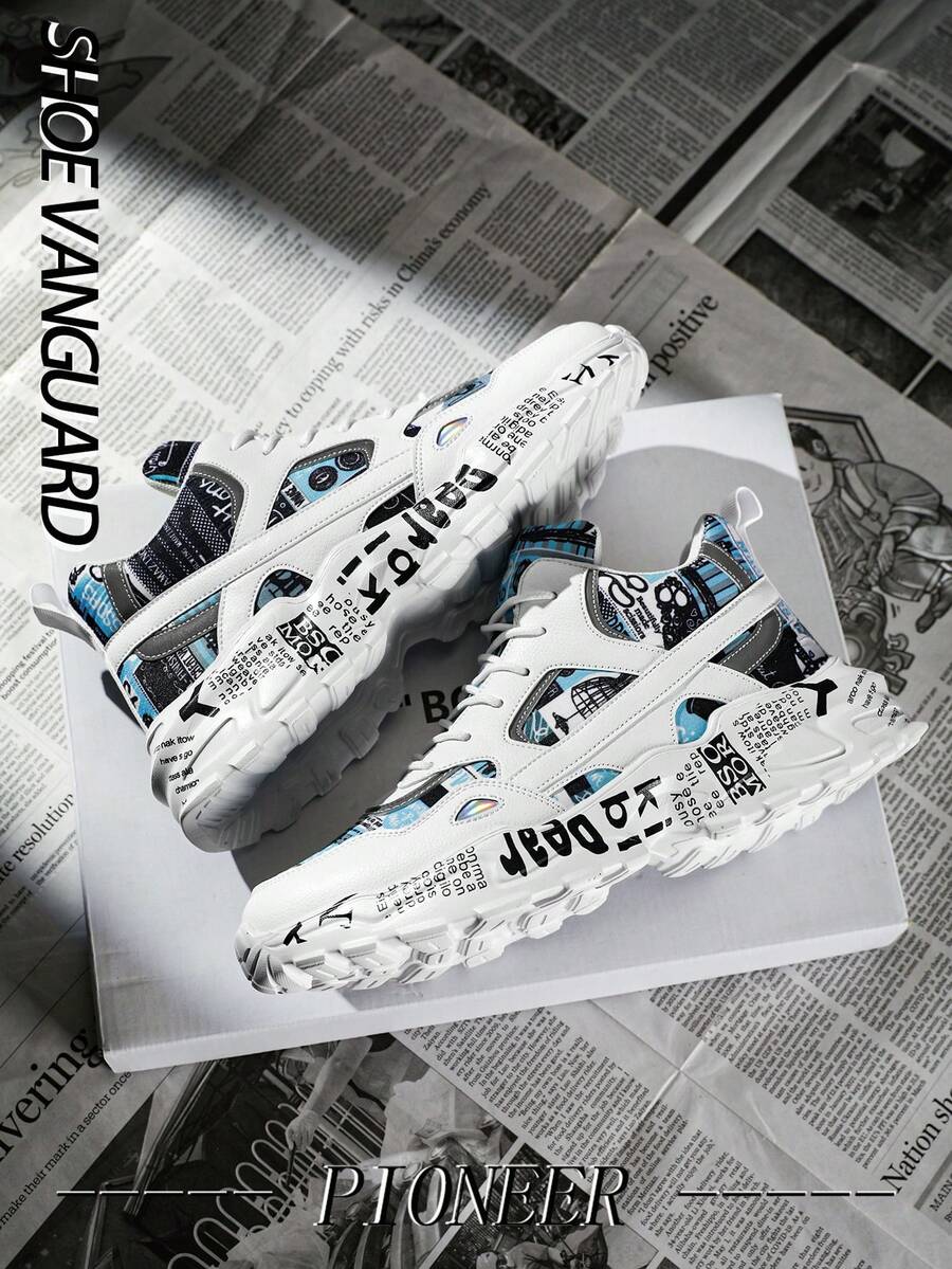 男士时尚涂鸦撞色字母贴片厚底运动鞋,舒适日常百搭休闲情侣运动鞋