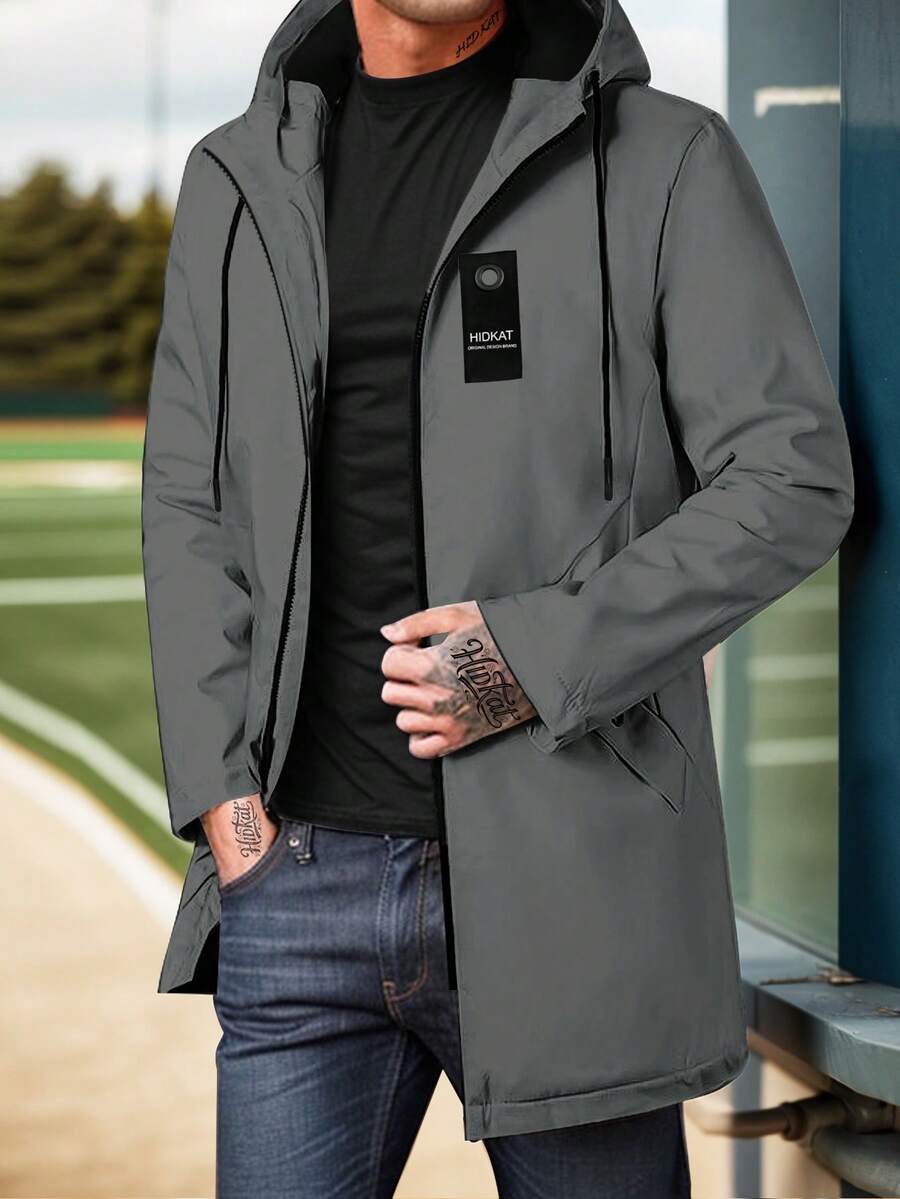 男士中长款户外徒步夹克,带抽绳连帽,纯色,休闲日常穿着,男友风格,秋冬