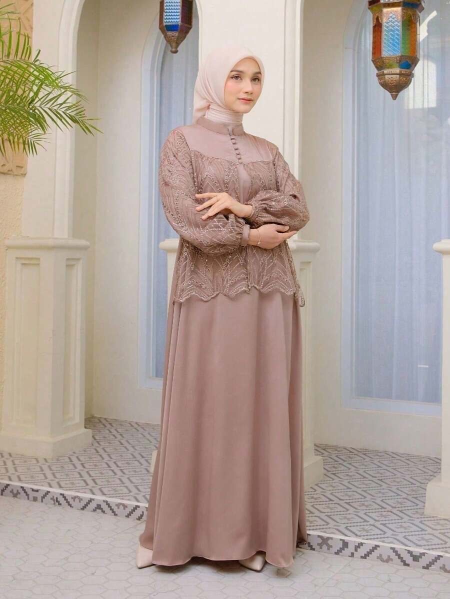 端庄女士灰褐色缀饰长款伊斯兰正式长袖连衣裙