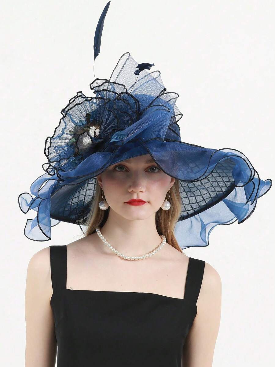 HIMESPORT 深藍色organza女士襯托帽,適用於女士茶會或德比頂部遮陽帽,帽子上有網眼花朵裝飾