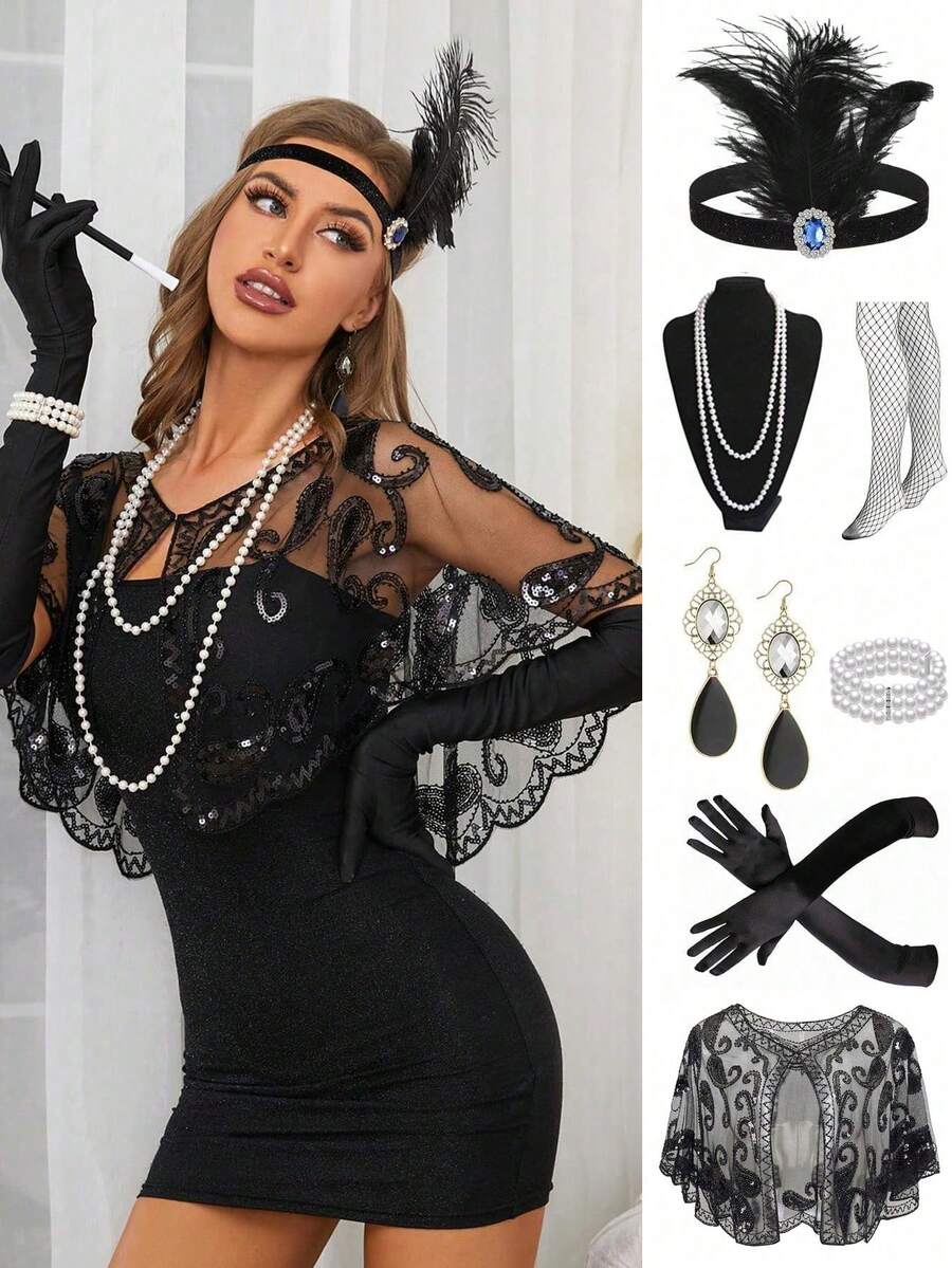 7 件套万圣节圣诞节 1920 年代派对装背心、了不起的盖茨比派对复古 Cos 装扮 1920 年代轻佻女郎人造羽毛头带合金水钻耳环长珍珠颈链项链 1920 年代披肩缎面手套套装女士 20 年代轻佻女郎配饰盖茨比主题派对、镂空渔网袜、镂空中号渔网/精细针织长袜、女士透明图案披肩、耳环、项链、手镯、羽毛头带、长手套
