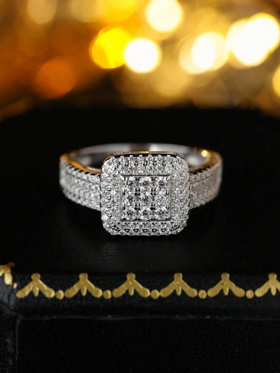 1 件 925 纯银镀白金复古方形水钻戒指,女士奢华生日派对珠宝,随机盒装款式