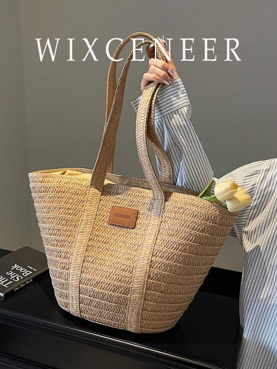 新款时尚草编水桶包,大容量编织单肩手提包,休闲度假手提包