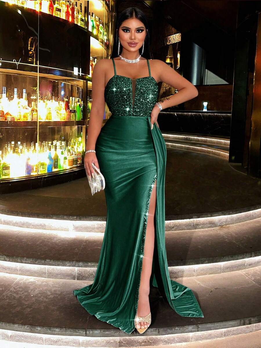 CHOSMO 优雅亮片拼接高开衩吊带裙,适合派对穿着