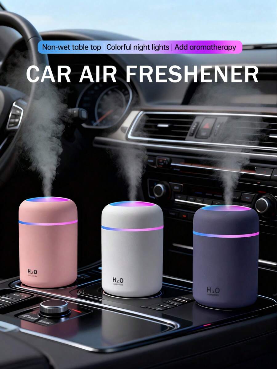 一个300毫升车载空气清新剂,室内香氛加湿器,USB供电,两种工作模式,7色LED灯,缺水智能关机,静音喷雾,方便的精油扩散器,非常适合房间装饰、办公室、客厅、汽车使用,也是送给女性的精美礼物。