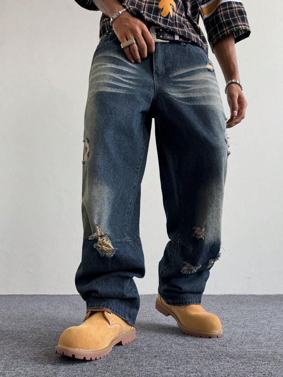 PAVTROS 男士做旧设计休闲百搭日常穿着阔腿牛仔裤
