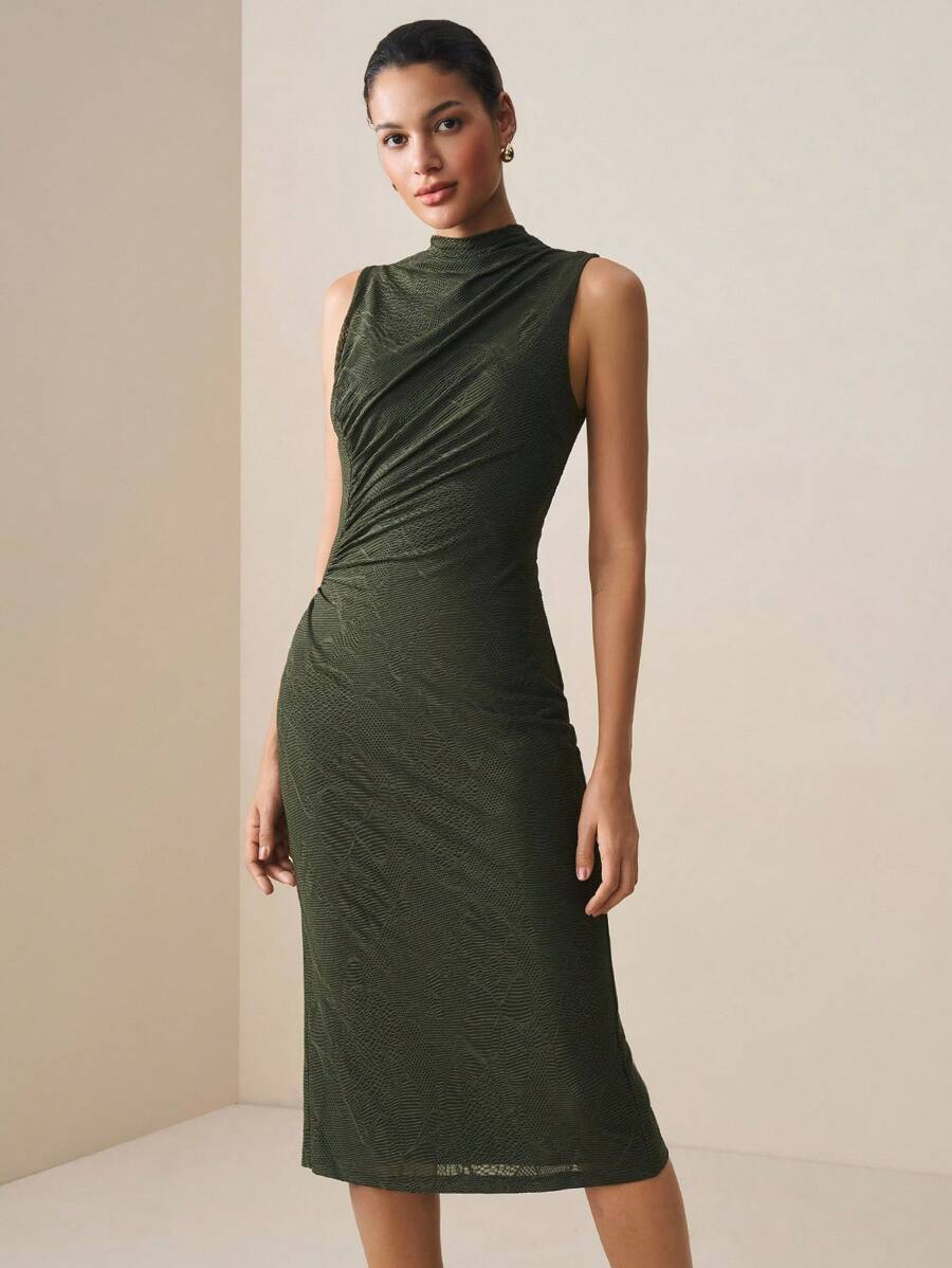 BizChic 2025秋季新款女装休闲时尚百搭简约无袖纹理橄榄绿复古风格街头休闲办公室约会派对郊游机场返校秋季连衣裙