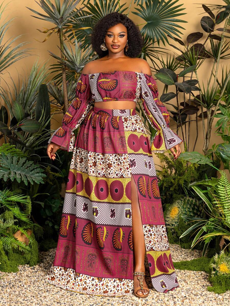 Faeriesty 加露肩长袖短款上衣和长裙休闲印花两件套度假造型和花卉印花休闲夏装和春装