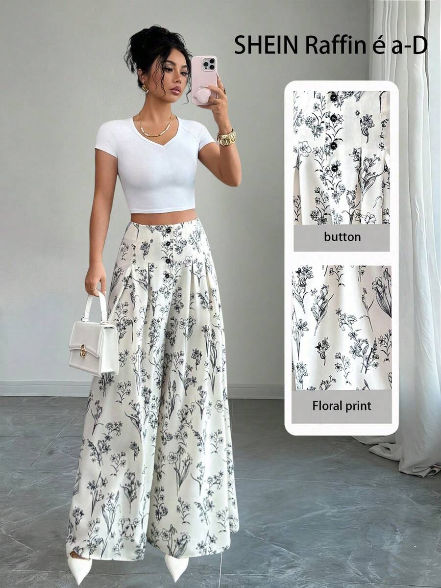 Rafferiza 女士印花褶裥前开襟纽扣裤