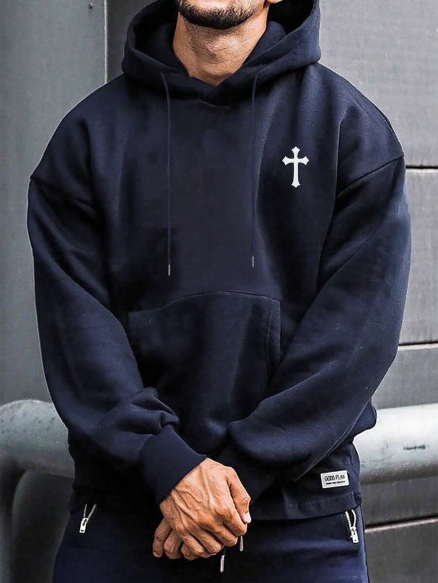 男士休闲简约十字印花抽绳连帽衫,带口袋,适合返校季、秋冬季穿着,长袖上衣