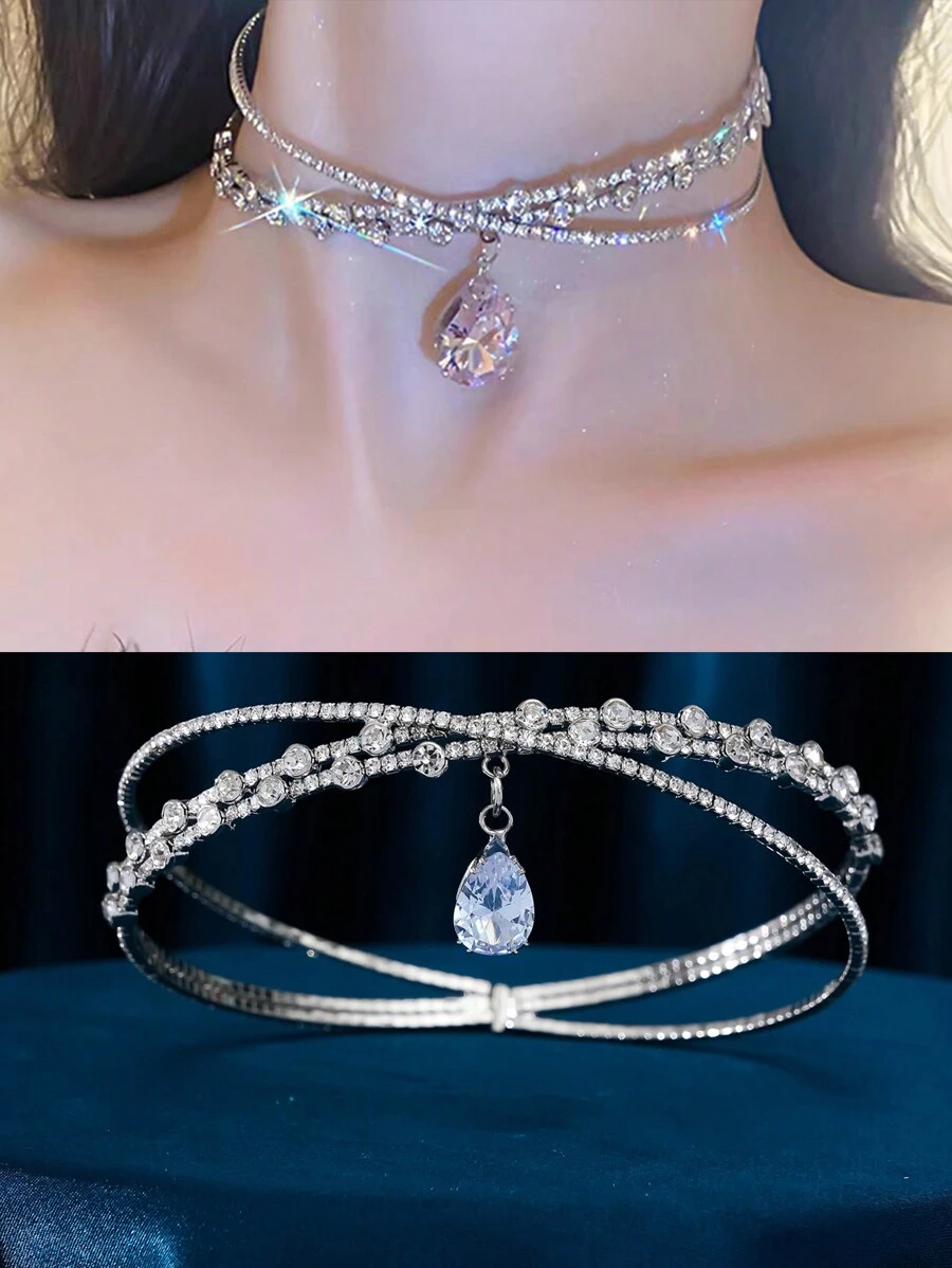 1件套优雅水滴形水钻公主项链及头链,椭圆形吊坠项链,奢华水晶新娘皇冠头饰,适合婚礼、派对、生日、角色扮演等场合的百搭首饰