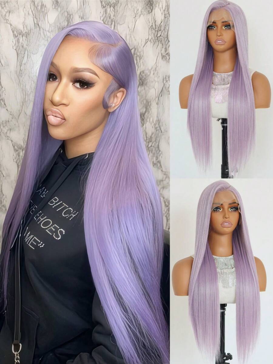 SALLYWELL 24英寸紫色蕾丝前假发,长直合成蕾丝前假发,无需胶水,自然预拔发际线