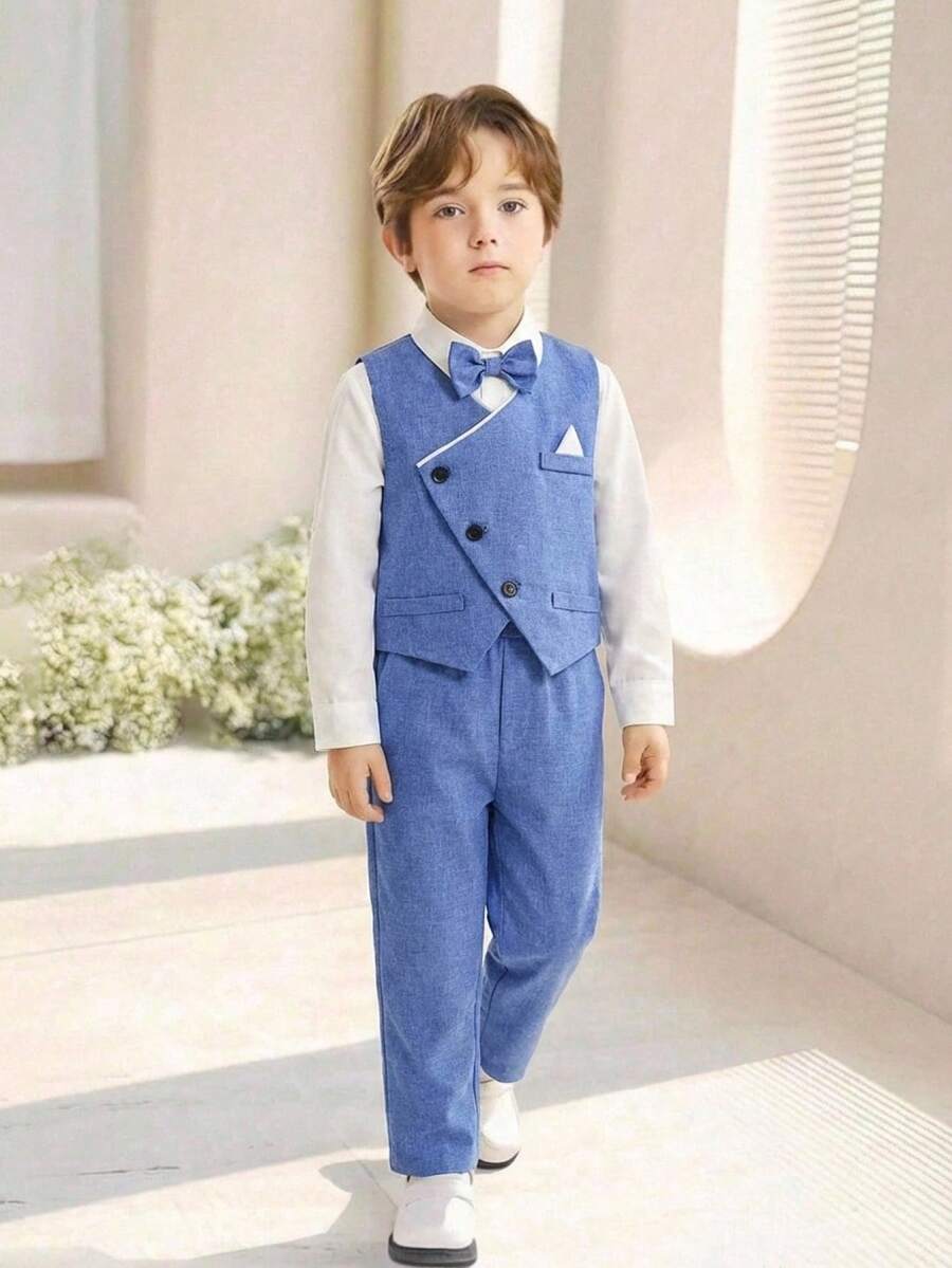 SHEIN 三件套男童绅士套装:蓝色松紧腰背心、斜襟长袖衬衫和领结,适合春夏穿着。