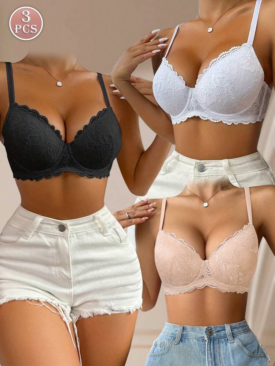 3件装女士多色蕾丝钢圈文胸,薄罩杯,透气舒适