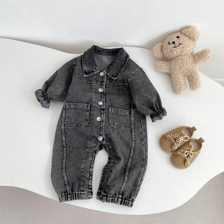 春秋季新款婴儿服装,男女宝宝宽松牛仔连体衣,翻领小熊刺绣长袖按扣牛仔连体衣