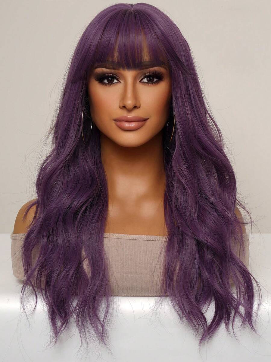 合成纖維耐熱假髮紫色長款卷波浪狀的假髮帶劉海假髮迷人紫色假髮逼真自然頭髮女性日常穿著角色扮演美麗頭髮