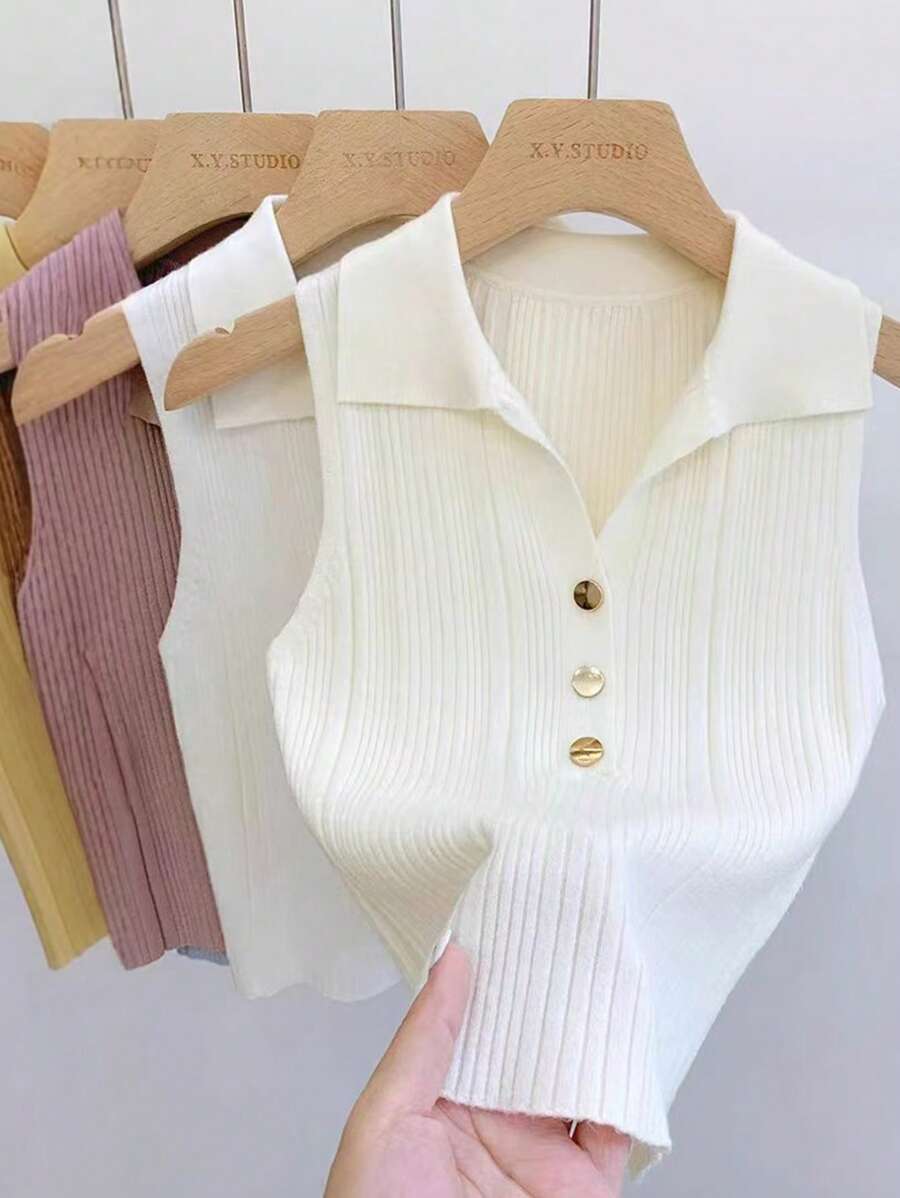 一件女士法式金色纽扣 Polo 领针织无袖短款吊带背心,可单穿或作为内搭。