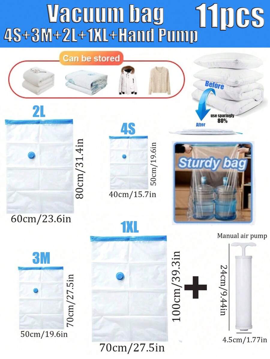 11-1 件真空储物袋,现代真空压缩储物袋,适用于家庭,防尘密封储物容器旅行配件,便携式塑料旅行袋衣物储物袋,适用于床上用品、衣服、被子,理想的家居用品,储物必需品节省空间袋整理器衣柜整理器卧室宿舍必需品衣服整理器家庭学校整理,夏季储物