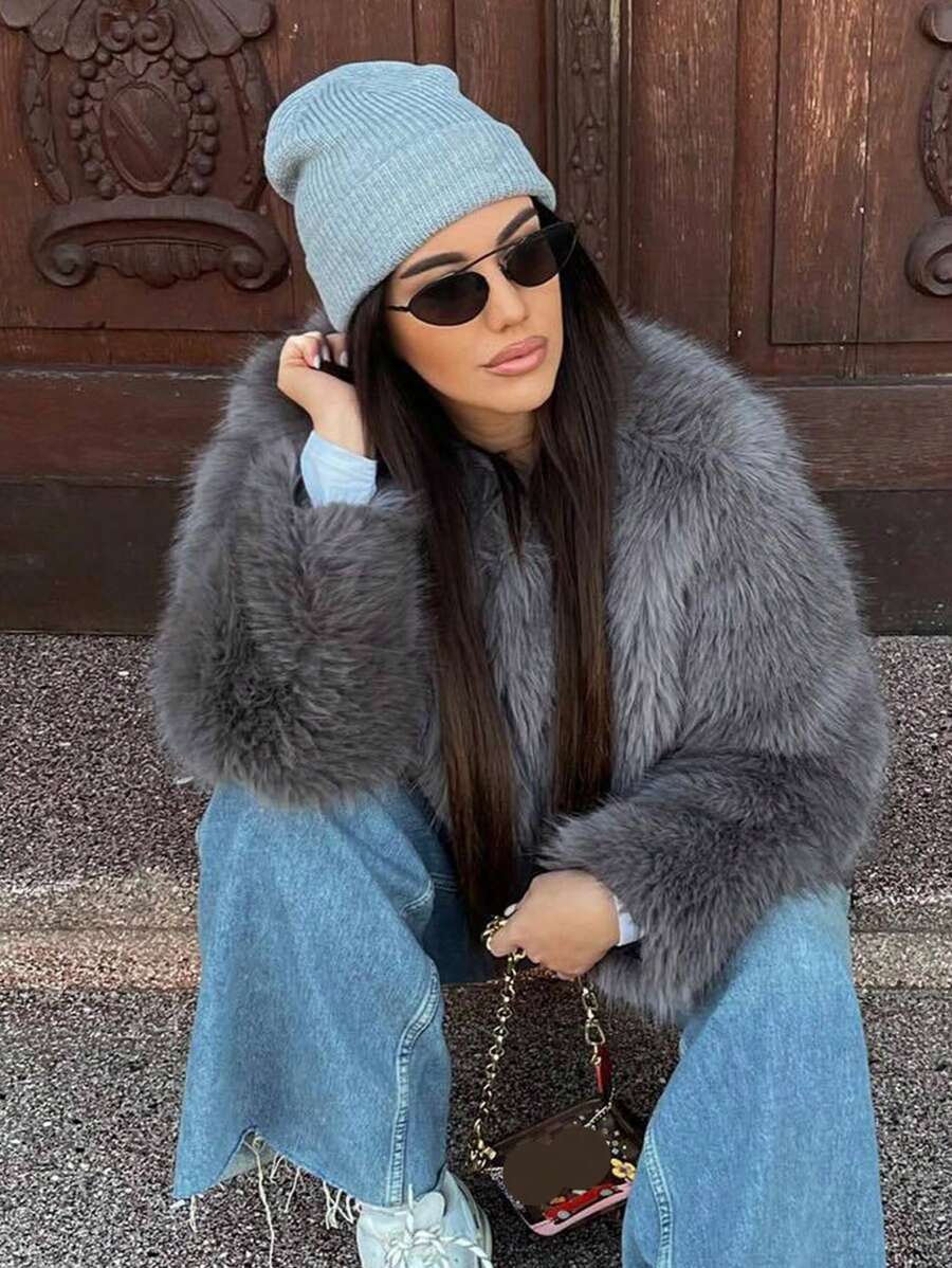 HH 女式仿皮草夹克优雅纯色翻领长袖外套休闲宽松女式冬季超大码淑女时尚街头风夹克