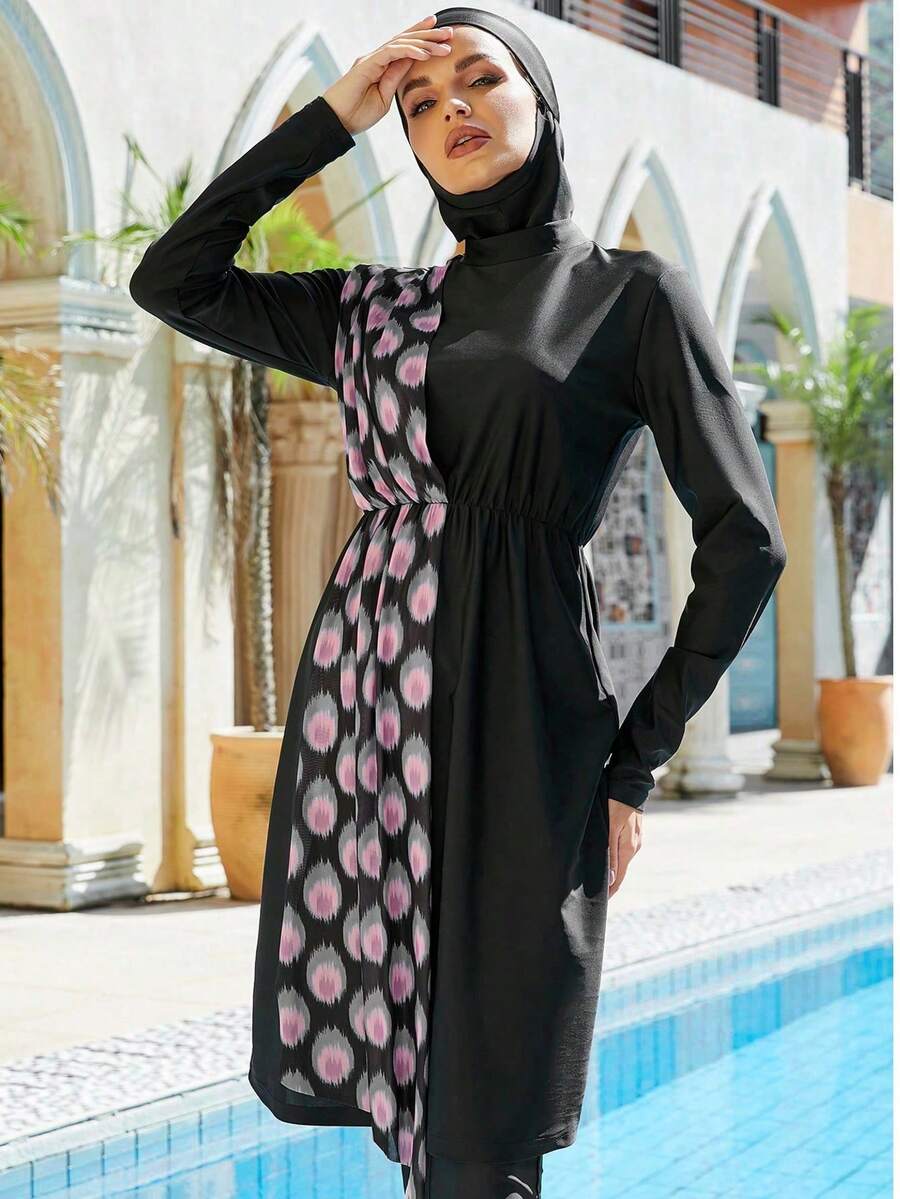 VFJ 三件套穆斯林女士泳装,伊斯兰保守泳装,含全包头巾、长袖上衣、连衣裙和裤子
