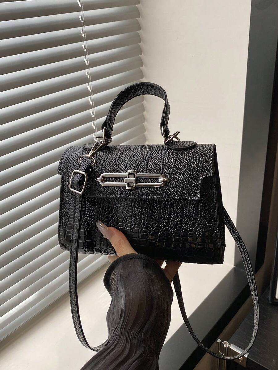 时尚简约鳄鱼纹PU压痕五金锁扣装饰翻盖手提包,多功能女士斜挎包。适合逛街、拎包、购物、年轻女性、大学生、新人、白领。非常适合办公室、大学、工作、商务、通勤、户外活动、旅行和短途旅行。