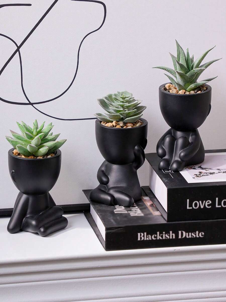 1/3盆仿真多肉植物,单盆小型人形多肉植物,3种款式可选,黑色陶瓷盆,卡通设计,PP/PE材质,绿色,适合桌面装饰、家居装饰、花园装饰、学校、宿舍、办公室装饰,情人节礼物