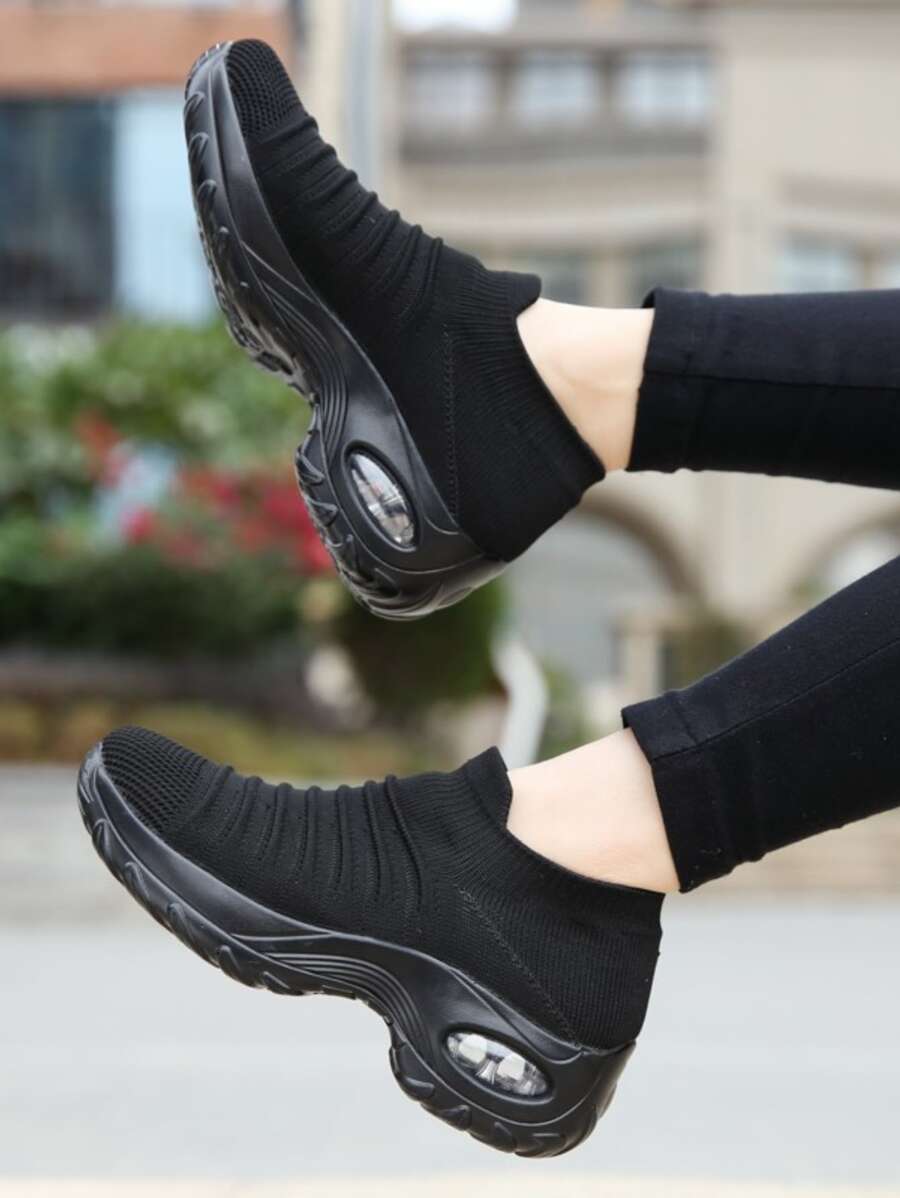 女款黑色針織襪式運動鞋,厚底,簡約運動步行鞋