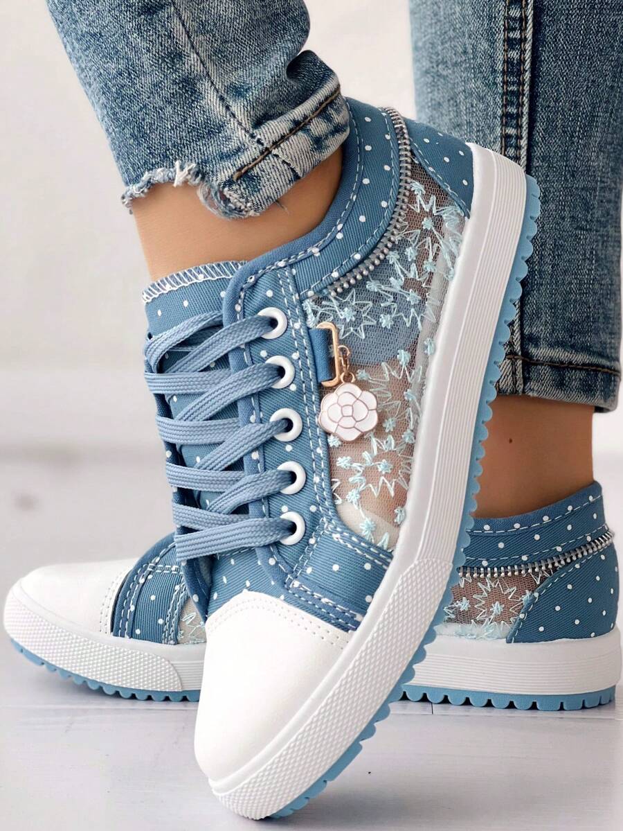 女士浅蓝色花卉装饰蕾丝网眼低帮休闲运动鞋,秋冬新款圆头系带拉链点缀女士鞋,休闲时尚滑板鞋