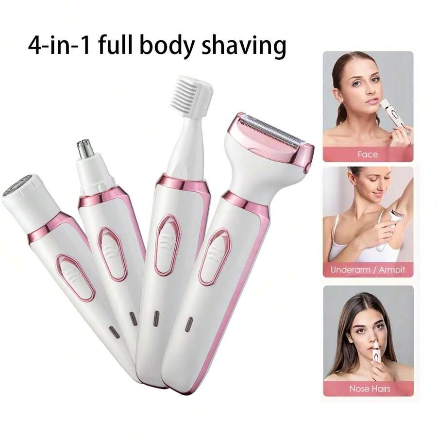 四合一可充电女士电动剃须刀套装,适用于面部、鼻部、腿部和腋下,干湿两用无痛比基尼修剪器,500mAh便携式可充电剃须刀