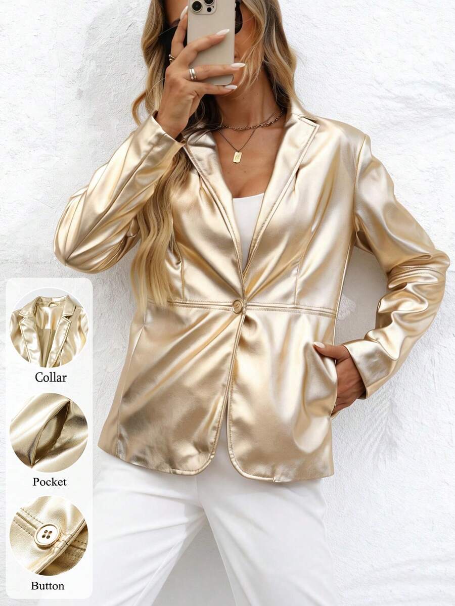 女士仿皮西装外套,长袖衬衫式翻领纽扣外套