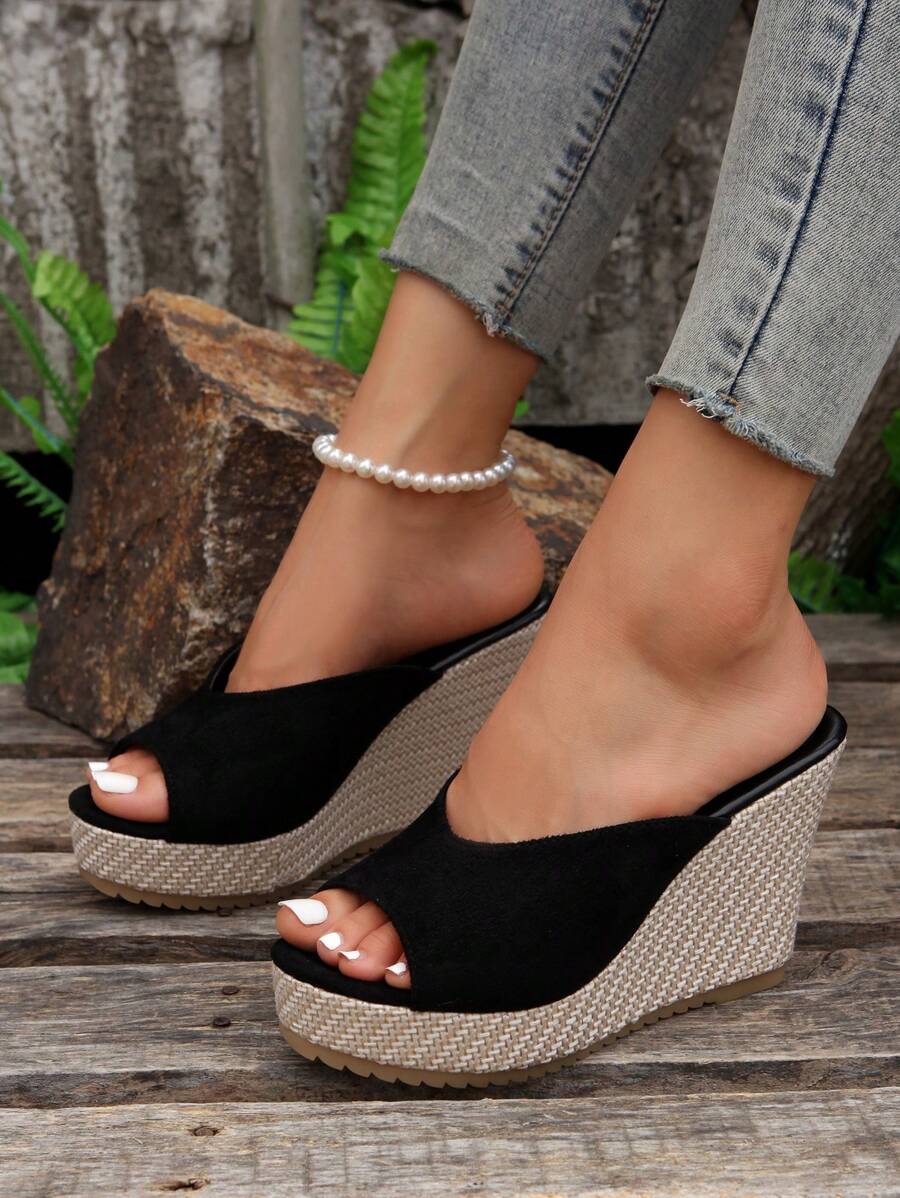 女士厚底坡跟凉鞋,露趾高跟鞋,厚底,草编鞋底,百搭沙滩鞋,黑色