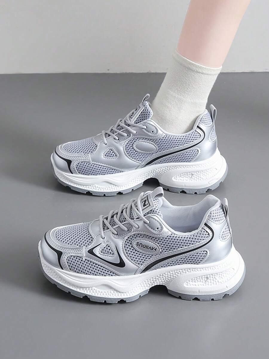 女士春秋新款网眼透气厚底休闲运动鞋,轻便系带时尚休闲鞋,适合跑步,白色、灰色、银色,尺码 36-41