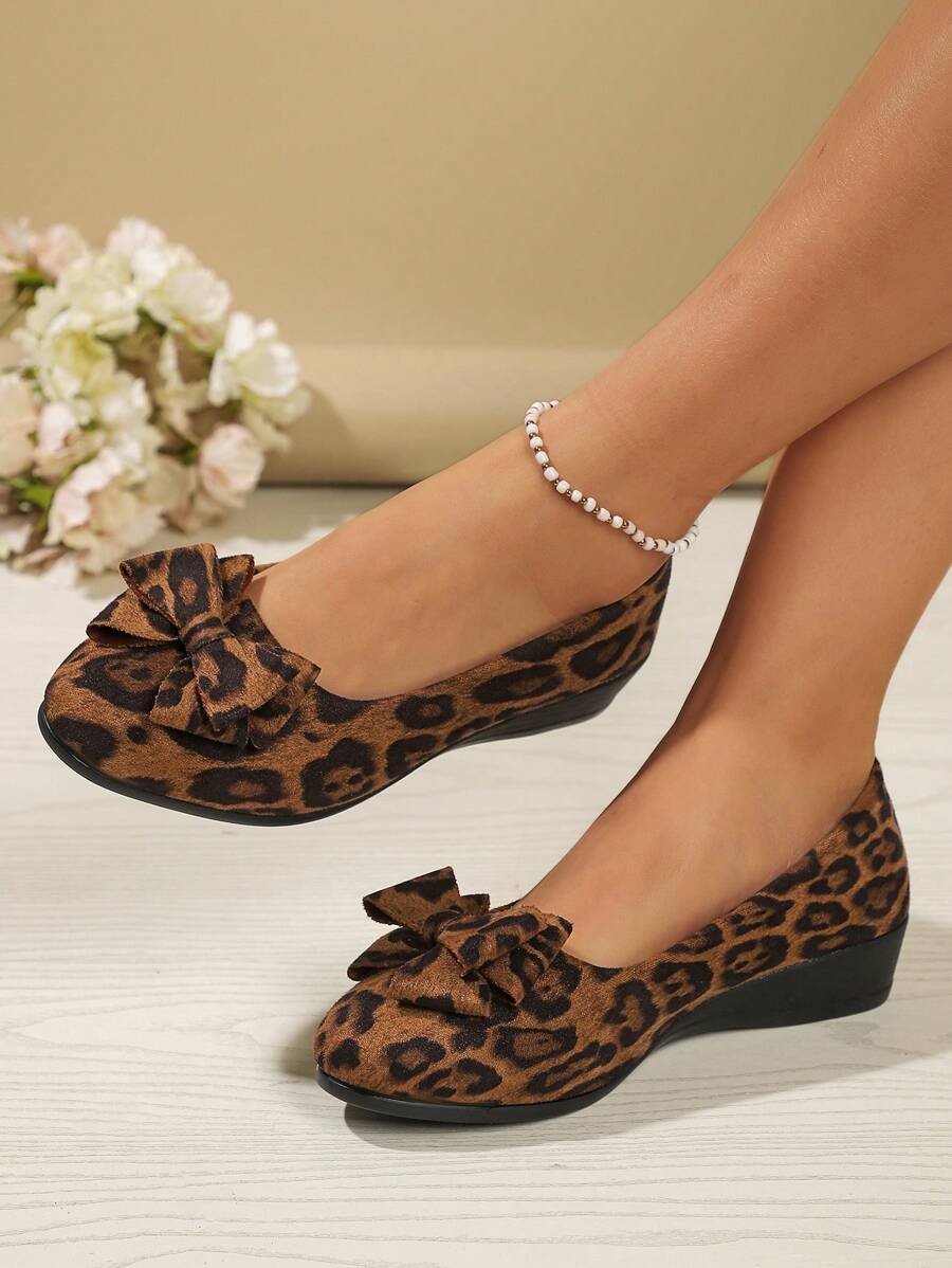 女式仿麂皮蝴蝶结装饰复古优雅坡跟圆头休闲一脚蹬平底鞋,纯色