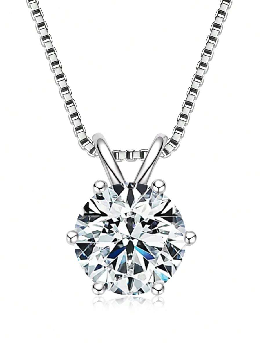 XUJIA 1件925银8毫米(2克拉)圆形莫桑石吊坠项链,女士经典时尚六爪吊坠项链,珠宝礼品,适合情侣佩戴