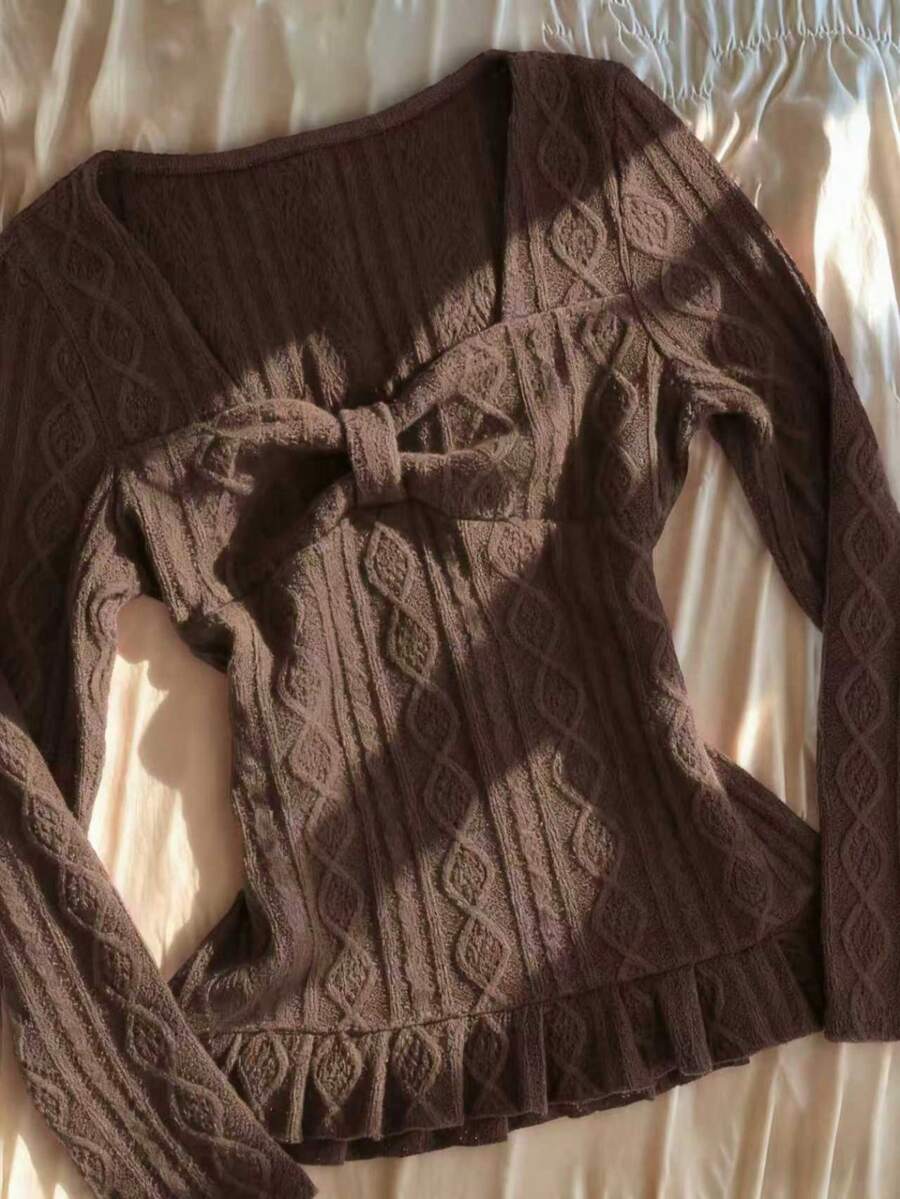 • Y2K复古原宿风女款交叉前襟长袖T恤,百搭朋克风休闲街头风修身薄针织衫,秋冬款 - 咖啡棕 - 查看 7