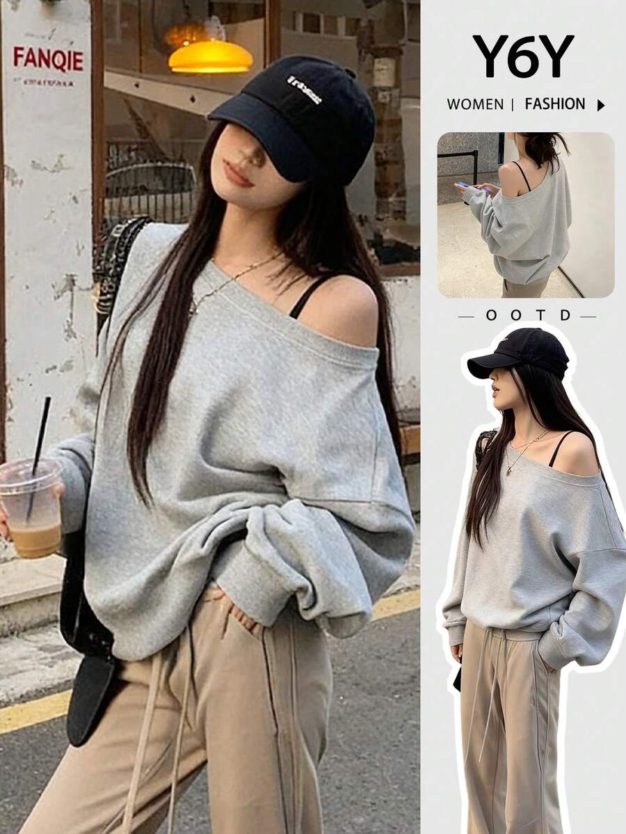 Y6Y 休闲时尚宽松不对称肩部女式卫衣,长袖露肩上衣,2025 年秋冬新品