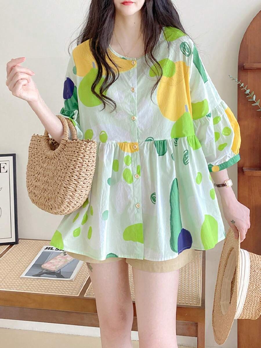 • YUXIN 夏季必备!女士清新水果印花灯笼袖宽松上衣。单排扣设计增添细节感。褶皱泡泡袖款式超级可爱。适合日常出行和度假野餐。透气面料让您整个夏天都保持凉爽!