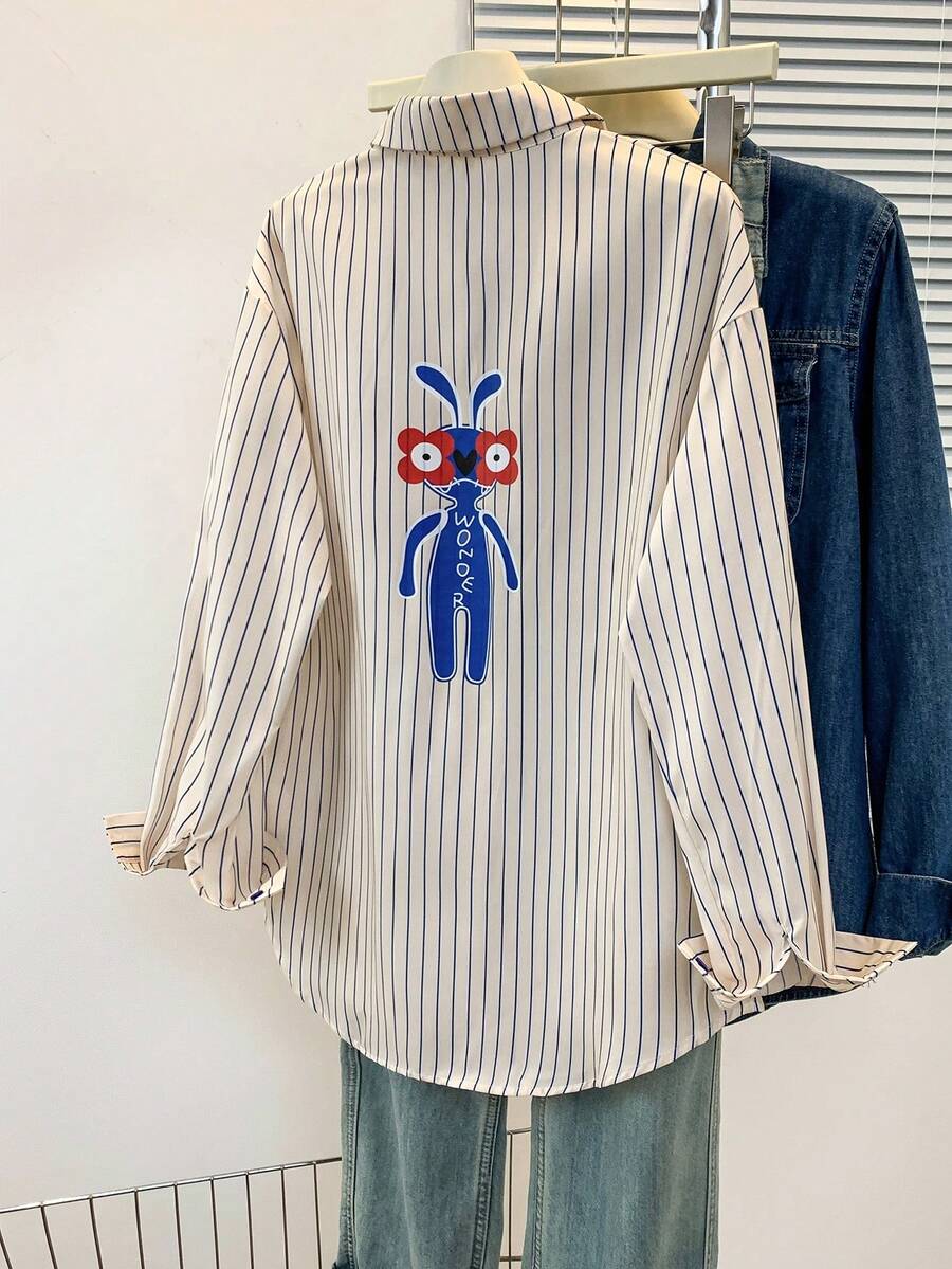 • YUXIN 女士春秋季趣味卡通兔子印花蓝色条纹衬衫,宽松休闲办公百搭修身长袖上衣 - 杏色 - 查看 2
