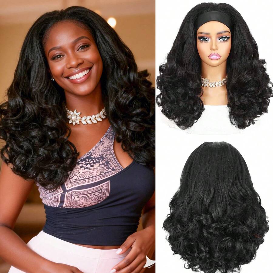 Yaki 女士卷发发带假发,黑色直发,发尾卷曲,合成材质,无需胶水,半头假发,带发带,16/20英寸