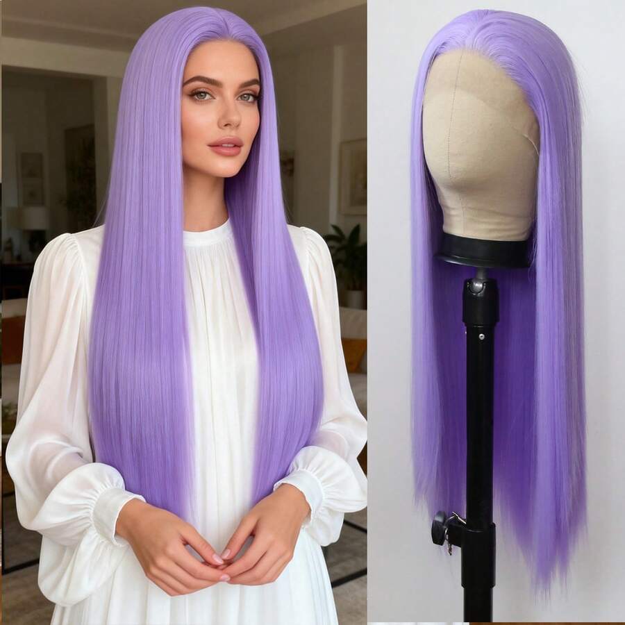 ZigZag Hair 13x4英寸合成蕾丝前假发,长直薰衣草色头发,预修剪自然发际线,无需胶水,无缝设计,耐热纤维,适合女性,深蓝色