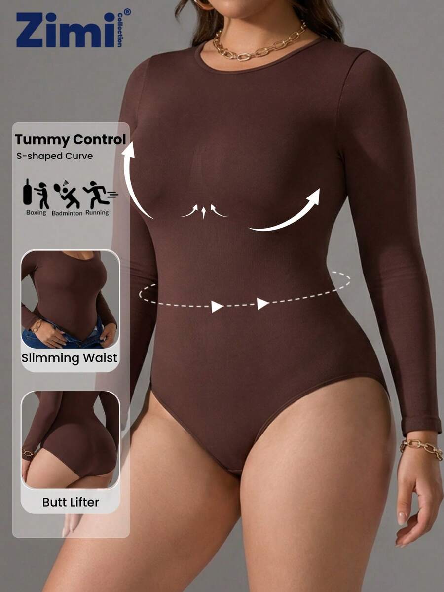 Zimi Collection 1 件装加大码无缝运动塑身连体衣,女款 1XL-5XL,棕色长袖提臀收腹运动连体衣,适合健身房训练、瑜伽、跑步等健身活动。