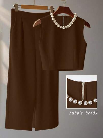 Franclia 法式高级时尚立体钉珠无袖上衣叠穿阔腿裤长裤夏季两件套女士夏装夏季两件套夏季