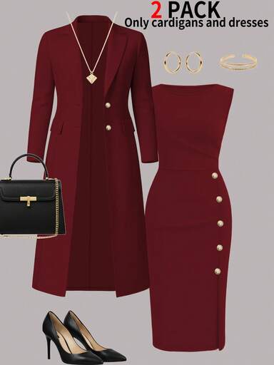 大码女士优雅两件套,纯色简约百搭长款开衫外套+修身中长连衣裙,适合日常通勤,春/秋/冬季穿着。